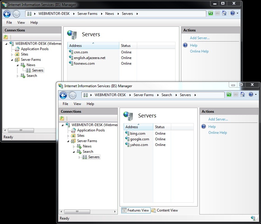 Start by installing the Application Request Routing module if you haven’t done so already. Now create two sever farms called “News” and “Search”. Add the search & news websites to each of their server farms like so: