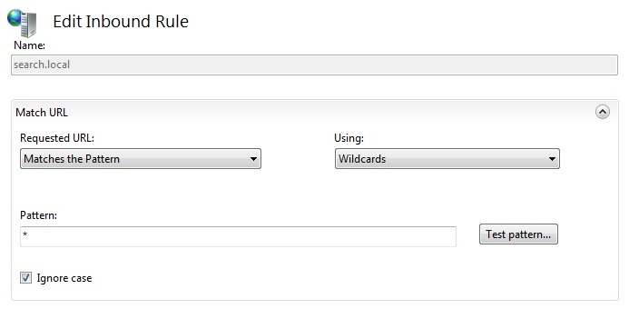 Go to the IIS level “URL Rewrite” settings page. If any default rules were created in the installation of IIS ARR, delete them now. Create a new rule from the blank template and call it “search.local”. Set the Match URL to use Wildcards and enter a pattern of “*”. This ensures that the rule matches and URL that we send to the server - no matter the hostname.