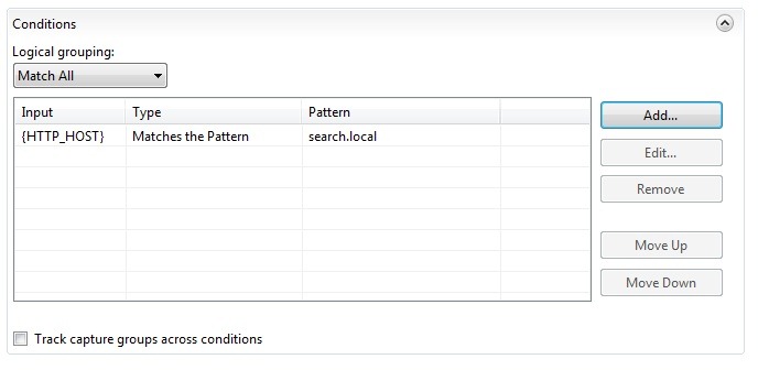 Expand the Conditions pane and add a new condition. Set the input to “{HTTP_HOST}” and type the pattern “search.local”. The {HTTP_HOST} condition ensures that this rule only matches requests to the search.local hostname.