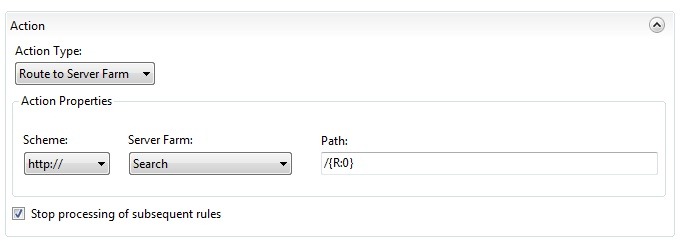 Finally set the action type to “Route to Server Farm” and choose the Search server farm. Tick the “Stop processing of subsequent rules” as the request should be routed onto the server farm as soon as this rule matches.