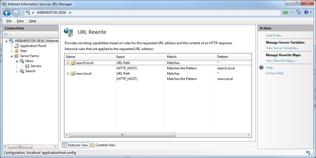 As the last step, create a second identical rule except it should be named news.local and have an {HTTP_POST} condition matching the news.local hostname. Setting up the rewrite rules can also be done in applicaitonHOst.config directly: