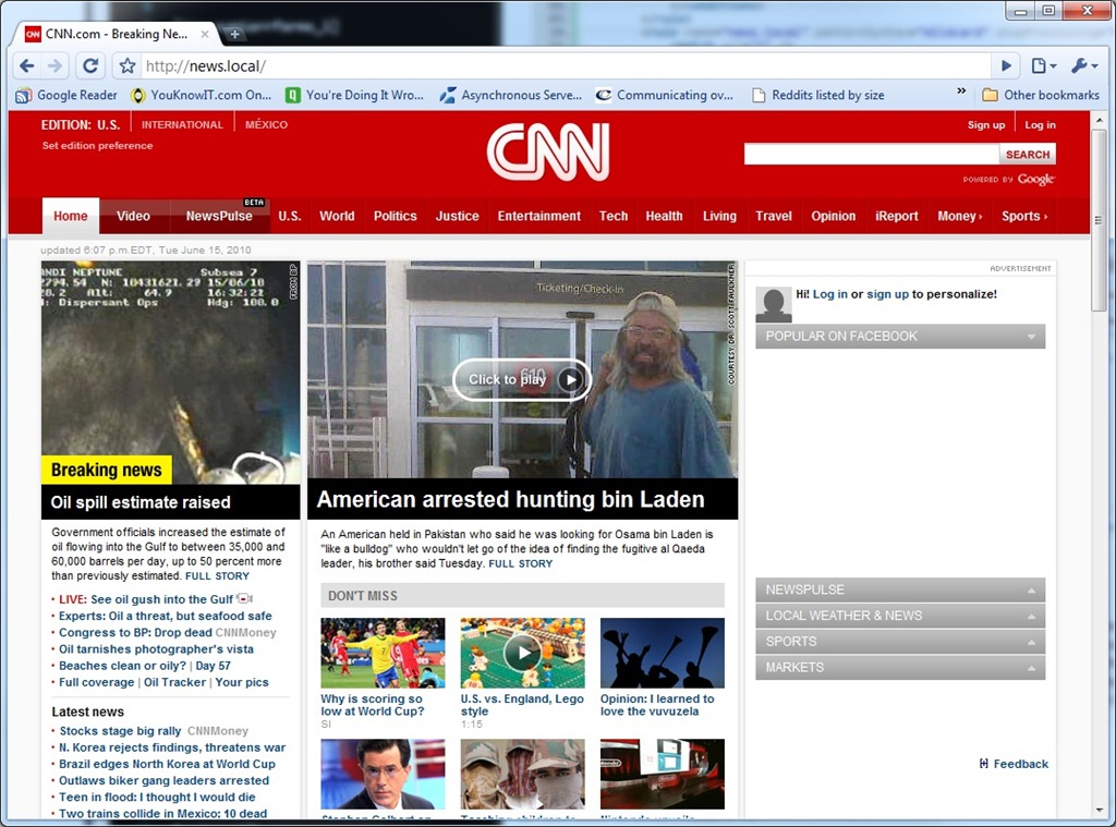 Note that this’ll only load CNN and Bing correctly as several of the other domains only listen to their configured domains (IIS ARR will proxy the reuqest onto the origin servers with a hostname request of search & news.local respectfully). I’ll follow up on how to fix that later on.